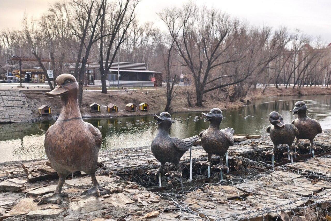 На входе в ЦПКиО поставили памятник утиной семьеВласти города просят не делать ничего плохого с металлическими птицами
