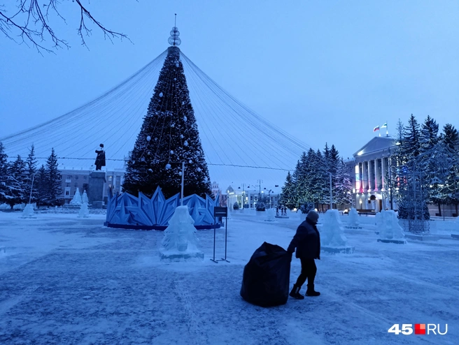 В 08:40 на Центральной площади Кургана выключили огни: потухла праздничная елка. С раннего утра городские уборщики начали чистить затоптанные ступеньки деревянных и ледовых горок и приводить столицу Зауралья в порядок после ночных массовых гуляний. В горсад вышли «отработчики» — дебоширы, тунеядцы и алкоголики, которым на несколько суток положены обязательные работы. К 9 утра город почти сверкал, и даже бордюры виднелись из-под сугробов, только начавшийся снегопад припорошил улицы.
